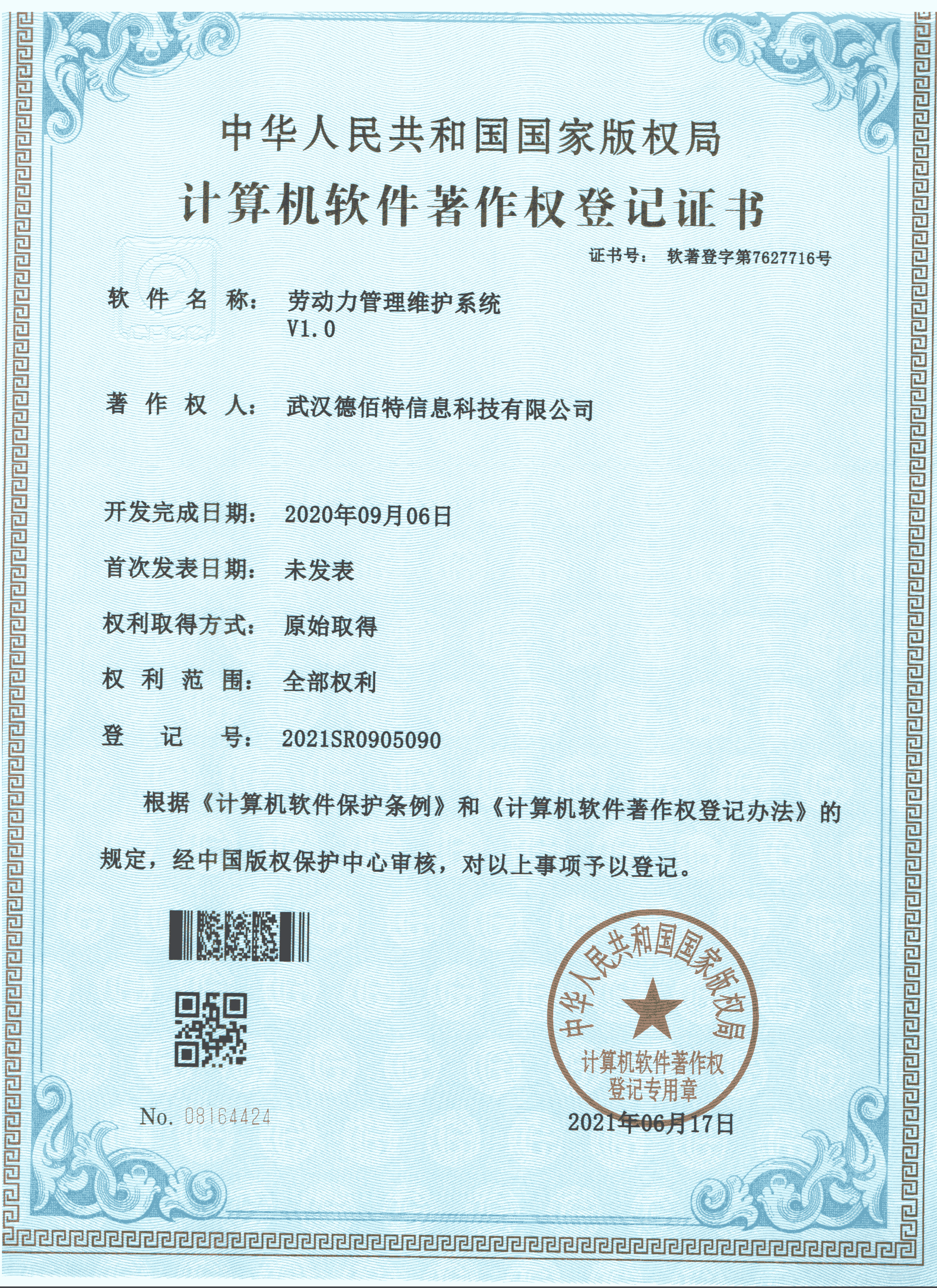 2020年9月6日 德佰特获得 "劳动力管理维护系统V1.0" 登记证书