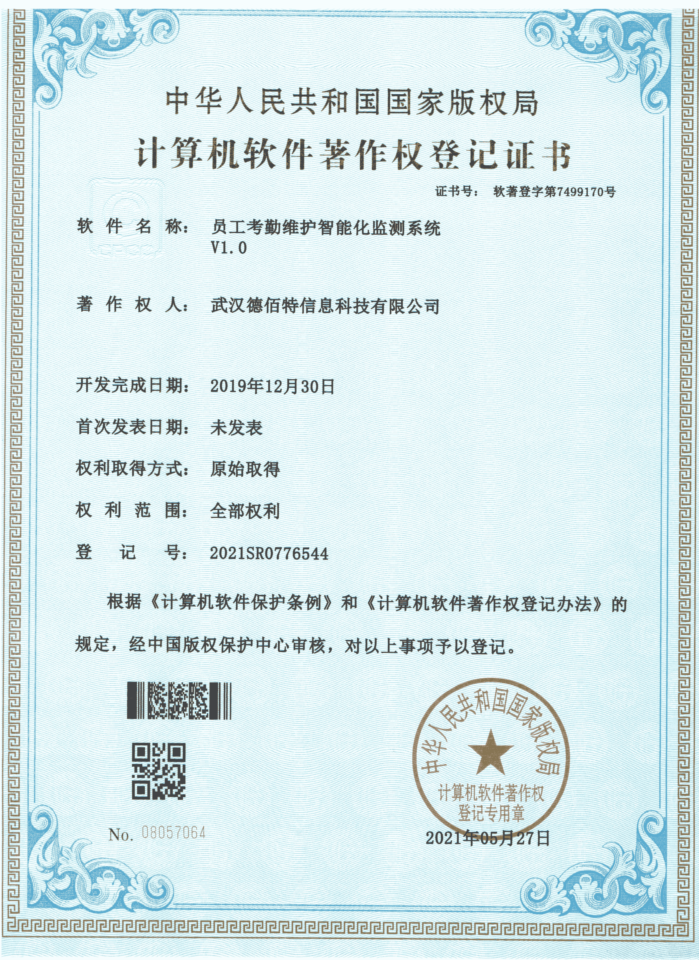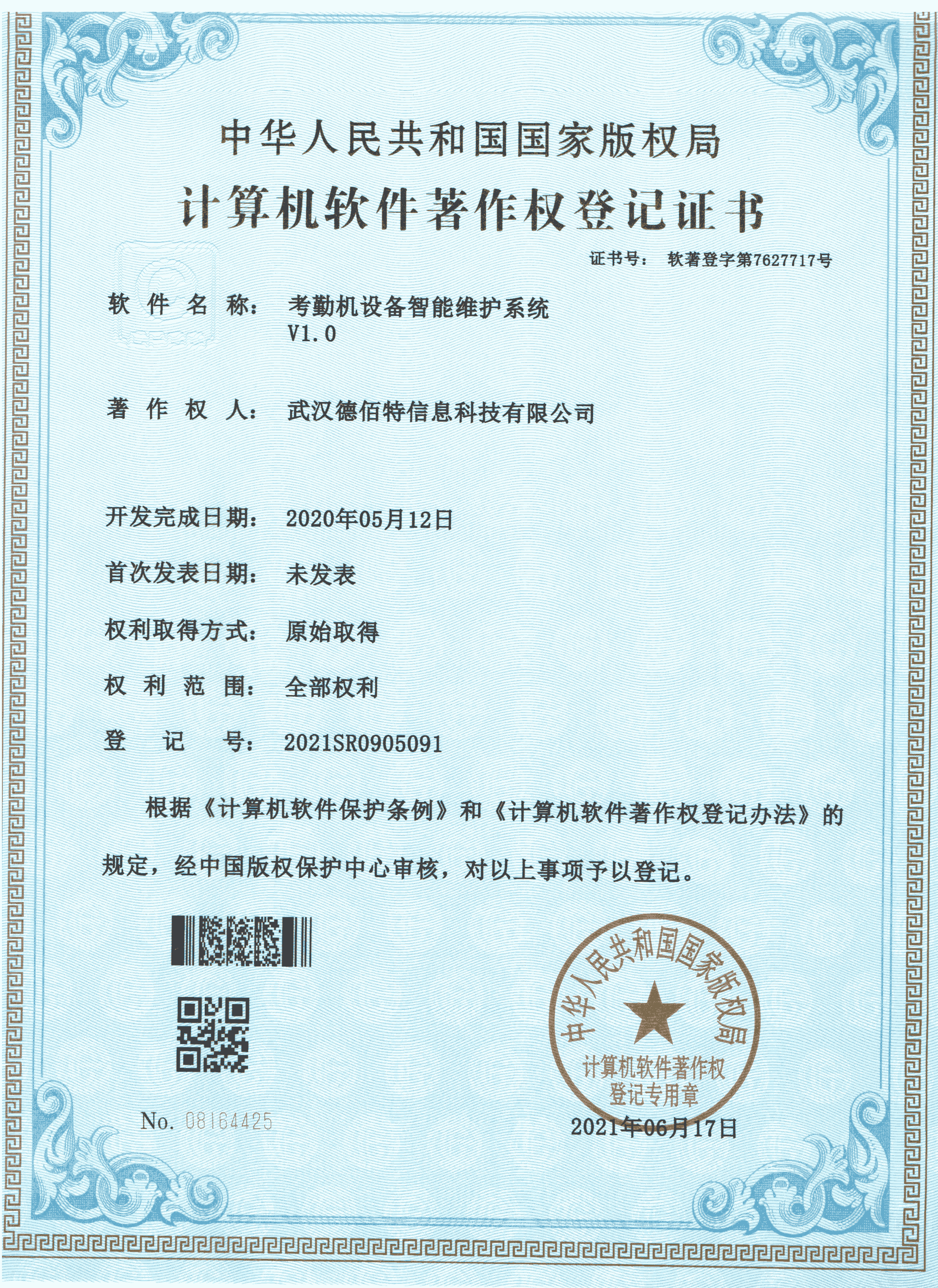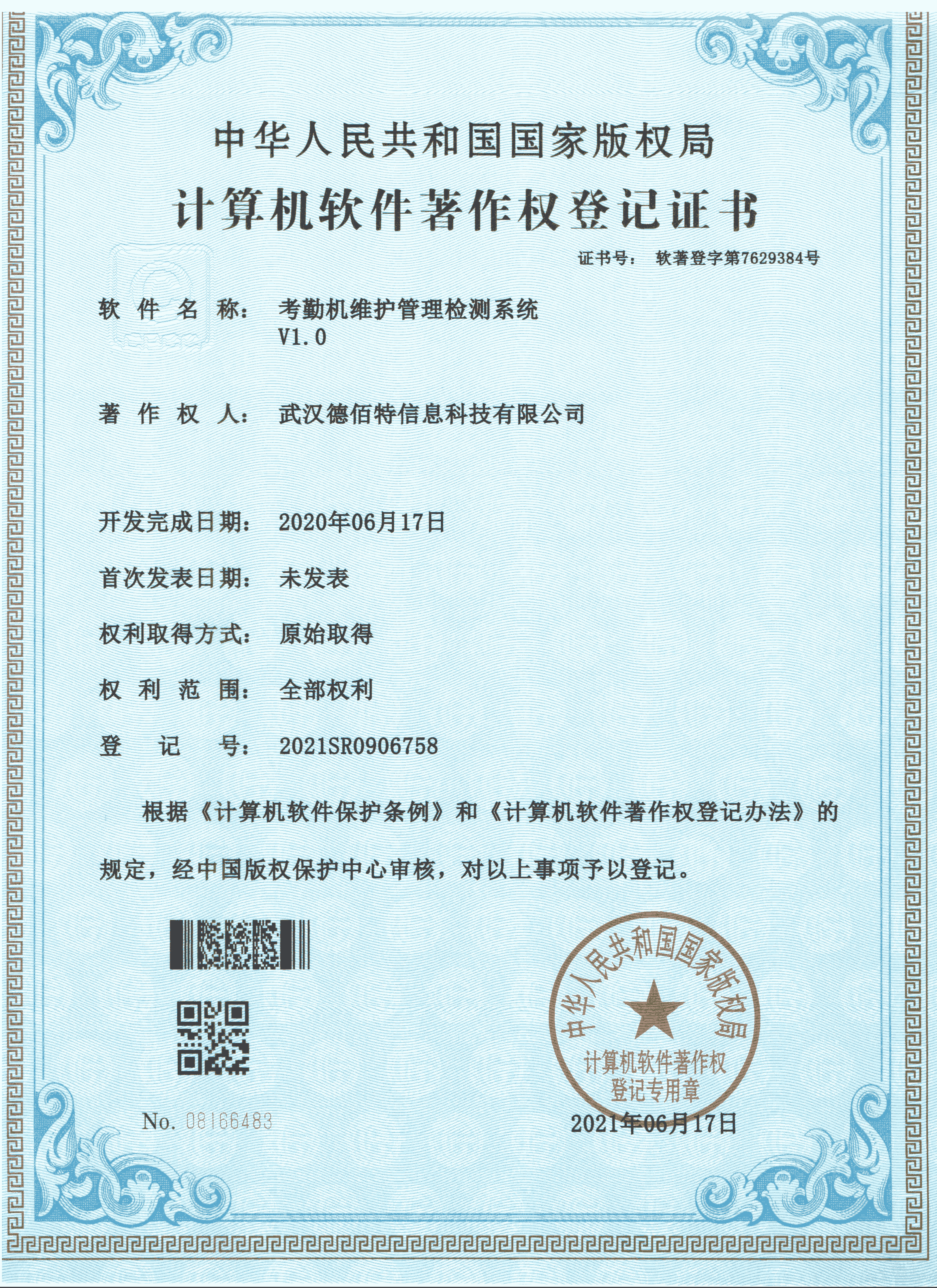 2020年6月17日 德佰特获得 "考勤机制维护管理监测系统V1.0" 登记证书