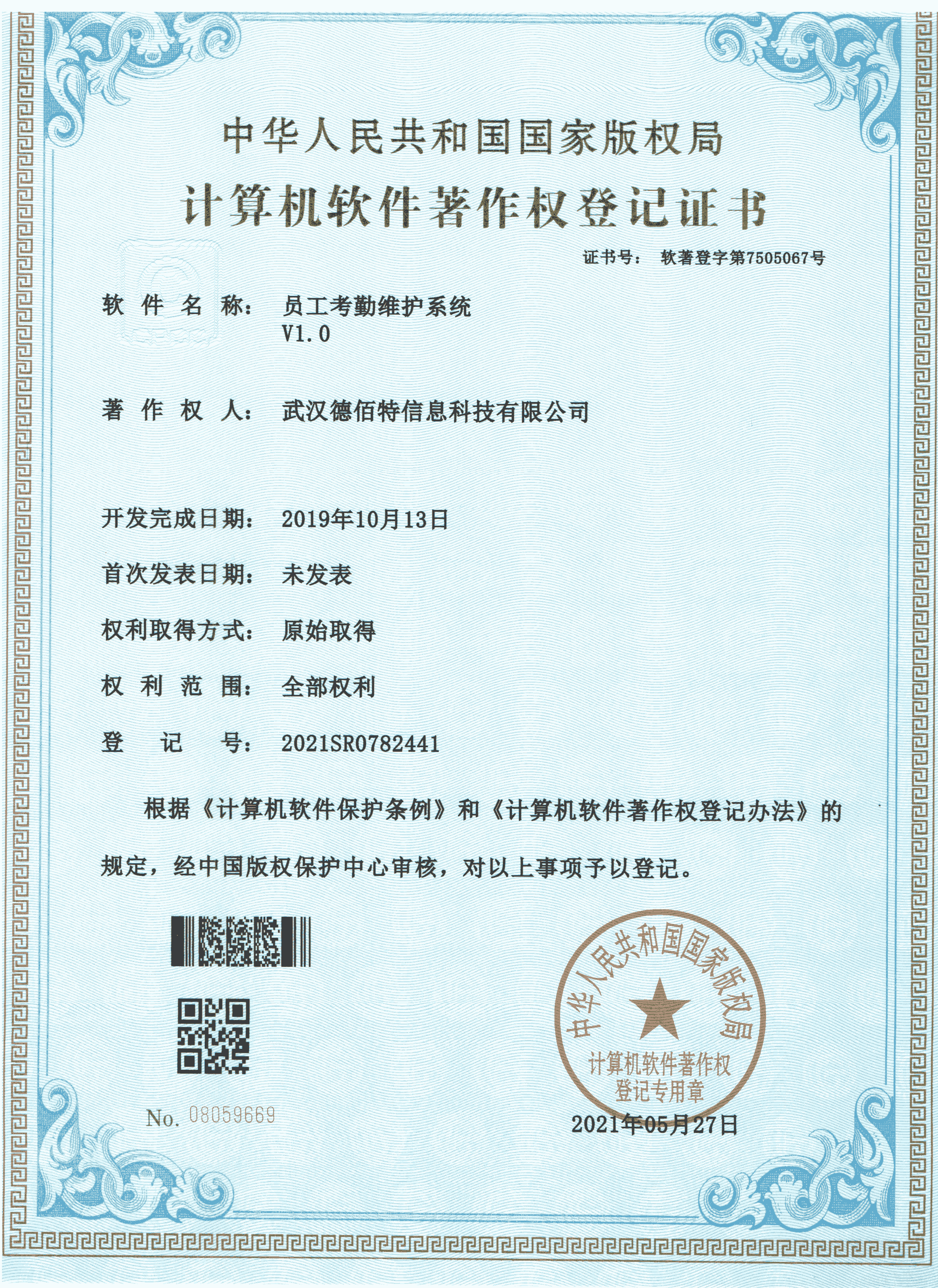 2019年10月13日 德佰特获得 "员工考勤维护系统V1.0" 登记证书