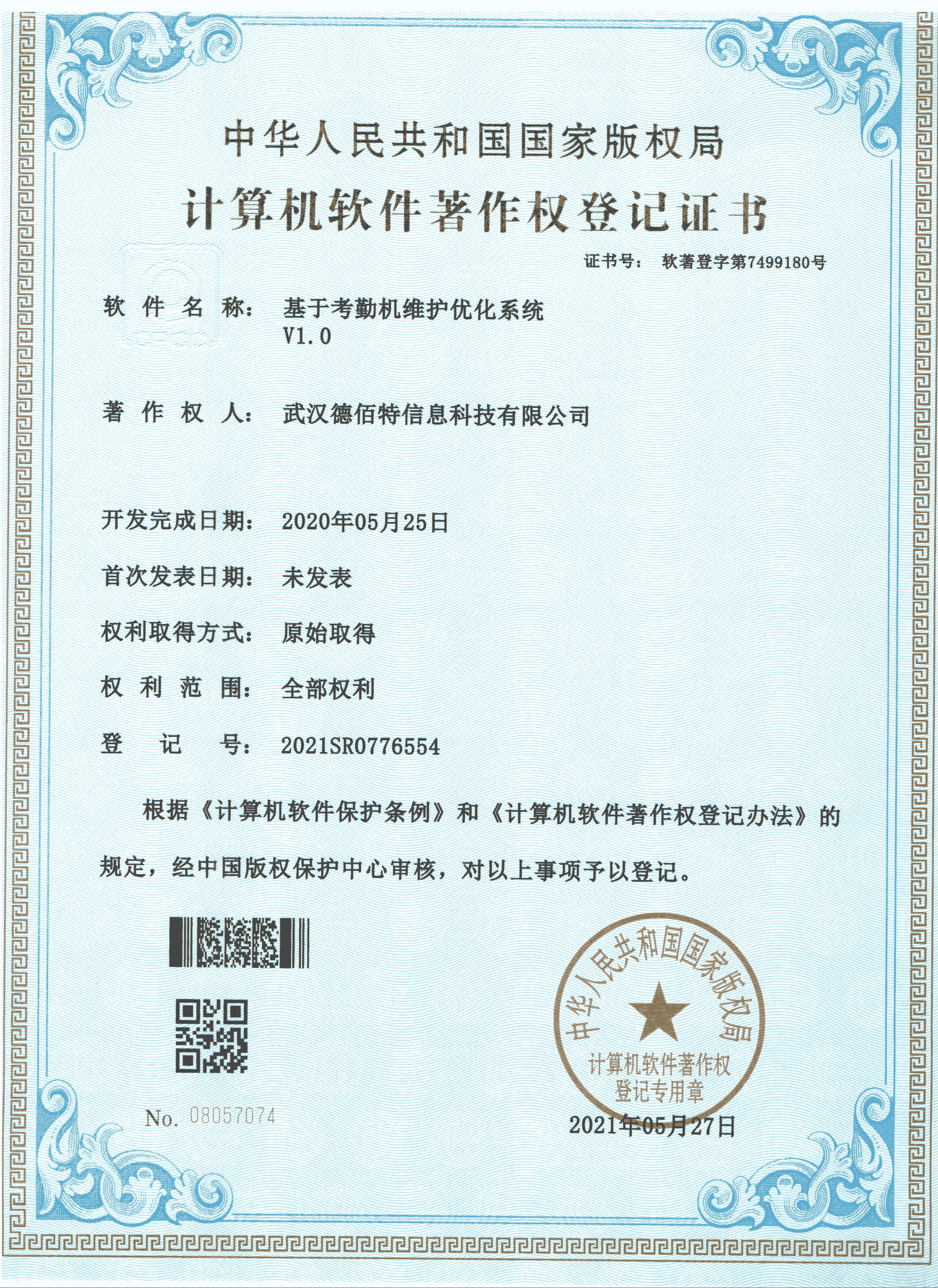 2020年5月25日 德佰特获得 "基于考勤机维护优化系统V1.0" 登记证书